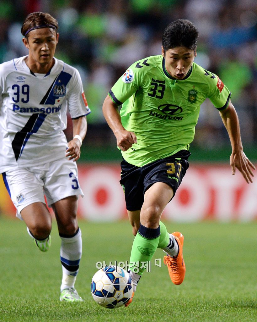 [전주=아시아경제 김현민 기자] 프로축구 전북 현대가 26일 전주월드컵경기장에서 감바 오사카(일본)와 AFC 챔피언스리그 8강 1차전을 했다. 전북 이근호가 상대 우사미의 수비를 뚫고 공격하고 있다. 김현민 기자 kimhyun81@asiae.co.kr<ⓒ세계를 보는 창 경제를 보는 눈, 아시아경제(www.asiae.co.kr) 무단전재 배포금지>