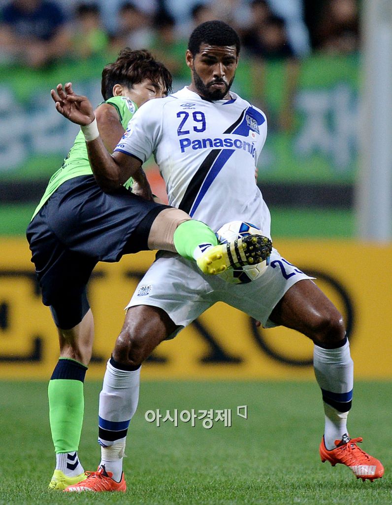 [전주=아시아경제 김현민 기자] 프로축구 전북 현대가 26일 전주월드컵경기장에서 감바 오사카(일본)와 AFC 챔피언스리그 8강 1차전을 했다. 전북 김기희가 상대 패트릭을 밀착 마크하고 있다. 김현민 기자 kimhyun81@asiae.co.kr<ⓒ세계를 보는 창 경제를 보는 눈, 아시아경제(www.asiae.co.kr) 무단전재 배포금지>