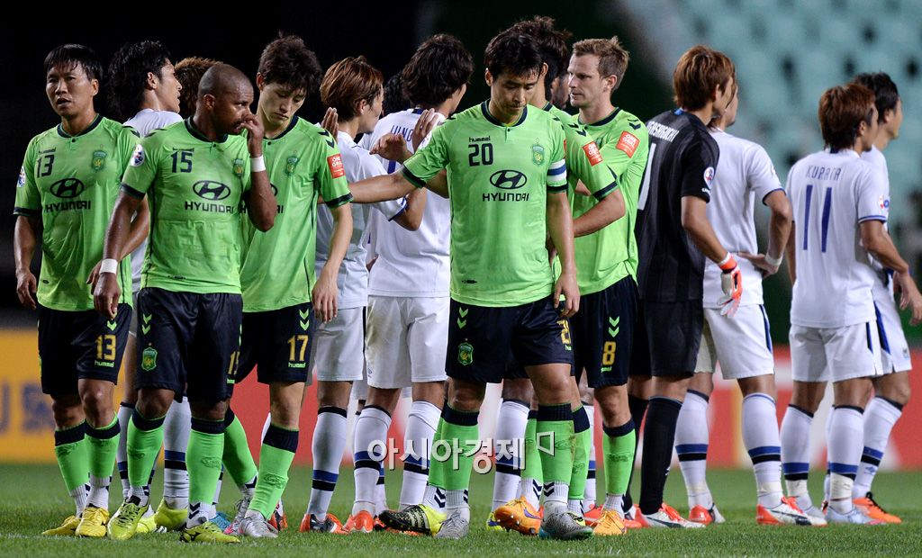 [전주=아시아경제 김현민 기자] 프로축구 전북 현대가 26일 전주월드컵경기장에서 열린 감바 오사카(일본)와의 AFC 챔피언스리그 8강 1차전에서 0-0으로 비겼다. 전북 이동국을 비롯한 선수들이 아쉬워하고 있다. 김현민 기자 kimhyun81@asiae.co.kr<ⓒ세계를 보는 창 경제를 보는 눈, 아시아경제(www.asiae.co.kr) 무단전재 배포금지>