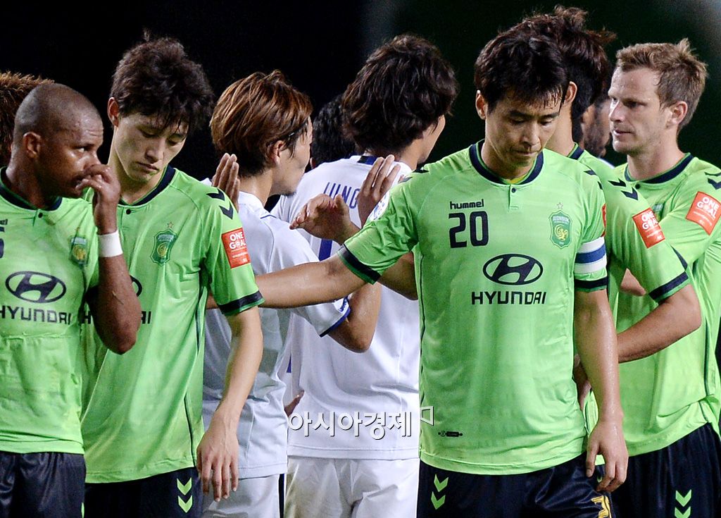 [전주=아시아경제 김현민 기자] 프로축구 전북 현대가 26일 전주월드컵경기장에서 열린 감바 오사카(일본)와의 AFC 챔피언스리그 8강 1차전에서 0-0으로 비겼다. 전북 이동국과 이재성이 아쉬워하고 있다. 김현민 기자 kimhyun81@asiae.co.kr<ⓒ세계를 보는 창 경제를 보는 눈, 아시아경제(www.asiae.co.kr) 무단전재 배포금지>