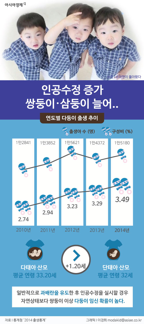 인공수정 등의 영향으로 쌍둥이 출산 사례가 늘고 있다. 25일 통계청이 발표한 '2014 출생통계(확정)'에 따르면 지난해 태어난 출생아 중 다태아의 구성비는 3.49%로 최근 몇년간 꾸준히 증가세를 보이고 있다.지난해 태어난 다태아는 1만5180명으로 전년 대비 808명이 늘었다. 9000명대 수준이었던 10년전(2004~2005년)과 확연히 차이가 난다.이는 자연임신이 어려운 부부가 과배란 인공수정 등 산부인과 시술을 통해 임신하는 사례가 늘었기 때문으로 분석된다. 일반적으로 과배란 인공수정시 다태아를 가질 확률이 높은 것으로 알려져 있다.박충훈 기자 parkjovi@asiae.co.kr이경희 디자이너 modakid@asiae.co.kr<ⓒ세계를 보는 창 경제를 보는 눈, 아시아경제(www.asiae.co.kr) 무단전재 배포금지>