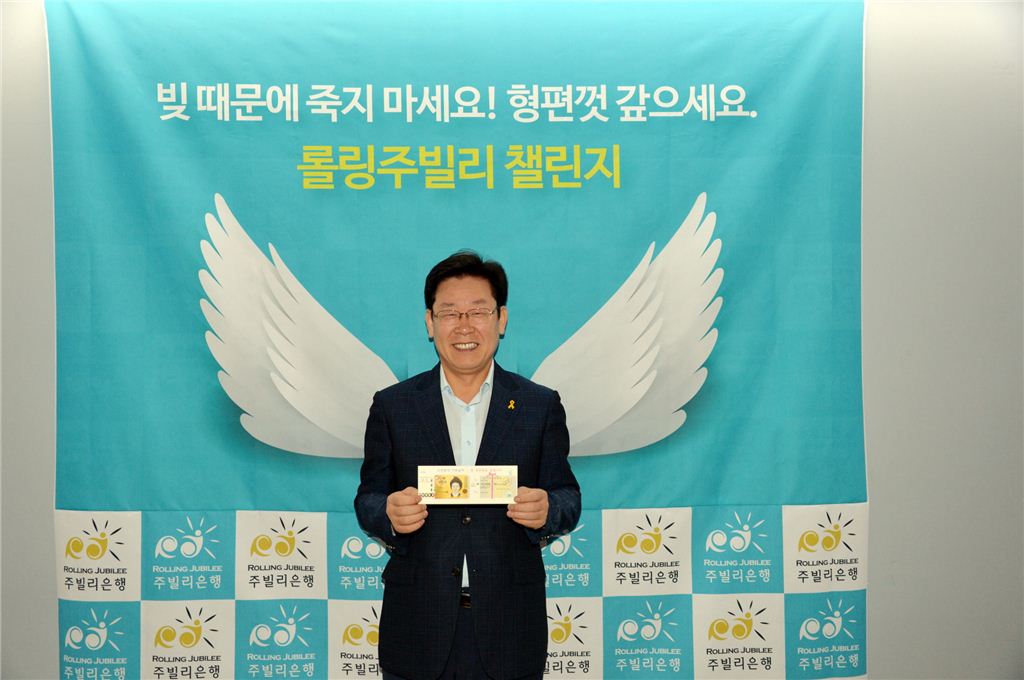 [아시아경제(성남)=이영규 기자] 장기부실채권을 사들여 채무자들의 빚을 탕감해주는 '주빌리은행'이 27일 성남에서 출범했다. 주빌리는 일정한 기간마다 죄를 사하거나 부채를 탕감해 주는 기독교적 전통에서 유래된 용어다. 25년은 실버 주빌리, 50년은 골든 주빌리, 60년은 다이아몬드 주빌리, 70년은 플래티넘 주빌리라 불린다. 주빌리은행은 영리를 목적으로 한 일반 상업은행과 다르다. 일반 은행처럼 예금과 대출업무를 하는 것이 아니라 장기연체자의 악성채권을 매입한다. 이들 악성채권은 대개 대부업체로부터 1~10%에 구입하는데, 금융거래 가치를 잃은 것이 대부분이다. 주빌리은행은 채무자에게 원금의 7%만 상환하도록 하고 저신용자를 정상적인 경제활동인구로 유입시키는 역할을 한다. 매입비용은 기부금과 채무자들의 상환금 등을 활용한다. 주빌리은행은 빚으로 고통 받는 채무자들을 위한 교육과 상담도 진행한다. 주빌리은행의 공동은행장은 이재명 성남시장과 유종일 KDI(한국개발연구원)국제정책대학원 교수가 맡았다. 이 시장은 지난해 9월부터 성남형 빚탕감 프로젝트(롤링주빌리)를 추진하는 등 채무에 시달리는 서민들의 구제에 앞장서왔다. 실제로 성남시기독교연합회가 부활절과 주일헌금 등을 모아 1억원의 성금을 모으는 등 가시적인 효과도 거뒀다. 이를 제외하고도 성남에서만 총 3279만원의 성금이 모아져 486명의 빚 33억원을 탕감했다. 성남시는 성남FC의 유니폼에 '롤링주빌리'를 새기고 빚탕감 프로젝트의 공익광고도 하고 있다.이재명 성남시장이 서민들의 빚탕감을 위해 출범한 '주빌리은행' 출범식에 참석, 인사말을 하고 있다.