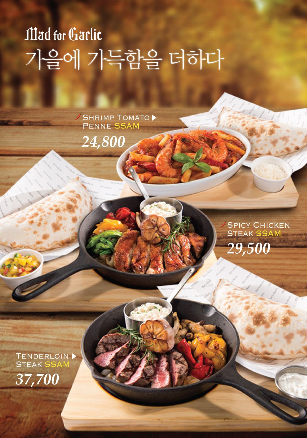 [아시아경제 최서연 기자] 마늘 테마 이탈리안 레스토랑 매드포갈릭이 가을 신메뉴 ‘퍼프쌈(Puff SSAM)’ 3종과 가을 와인 출시와 함께 기념 프로모션을 진행한다고 27일 밝혔다. 매드포갈릭은 퍼프쌈(Puff SSAM) 피자를 콘셉트로 가을 테마 신메뉴를 선보인다. 피자 도우 사이에 여러가지 재료를 넣어 싸서 먹는 이탈리아 정통 ‘깔조네 피자’를 모티브로 해 개발한 퍼프쌈 피자는 구름 모양으로 부풀어 오른 피자 도우에 다양한 재료를 넣고 쌈을 싸서 먹는 이색 메뉴다.매드포갈릭의 가을 신메뉴는 총 3가지로 ‘텐더로인 스테이크 쌈(Tenderloin Steak SSAM)’, ‘스파이시 치킨 스테이크 쌈(Spicy Chicken Steak SSAM)’, ‘쉬림프 토마토 펜네 쌈(Shrimp Tomato Penne SSAM)’이다. 모든 메뉴는 함께 곁들여먹을 수 있도록 갈릭 버터의 풍미가 가득한 매드포갈릭 특제 퍼프쌈 도우가 함께 제공된다. 이와 함께 가을 신메뉴와 조화를 이루는 가을 와인 ‘파머스 테이블 와인즈, 메리티지(Farmer’s Table Wines, Meritage)’와 ‘라 비에이유 페름 블랑(La Vieille Ferme Blanc)’도 출시했다. 가을 신메뉴 출시를 기념해 9월20일까지 가을 신메뉴 특별 프로모션도 진행한다. 기간 내에 3만원 이상 주문 시 정상가 3만7700원의 텐더로인 스테이크 쌈을 1만5000원, 정상가 2만9500원의 스파이시 치킨 스테이크 쌈을 1만2000원, 정상가 2만4800원의 쉬림프 토마토 펜네 쌈을 1만원에 만나볼 수 있다. 또한 행사 기간 동안 정상가 5만7000원의 가을 레드 와인 파머스 테이블 와인즈, 메리티지를 4만3000원, 정상가 5만2000원의 가을 화이트 와인 라 비에이유 페름 블랑을 3만8000원에 제공한다. 신메뉴 출시기념 프로모션을 이용할 수 있는 쿠폰은 및 매드포갈릭 카카오톡 플러스 친구와 매드포갈릭 공식 홈페이지(www.madforgarlic.com)에서 이벤트 페이지에서 누구나 상시 다운로드할 수 있으며 신메뉴 프로모션 쿠폰과 와인 프로모션 혜택은 중복 사용이 가능하다. 최서연 기자 christine89@asiae.co.kr<ⓒ세계를 보는 창 경제를 보는 눈, 아시아경제(www.asiae.co.kr) 무단전재 배포금지>