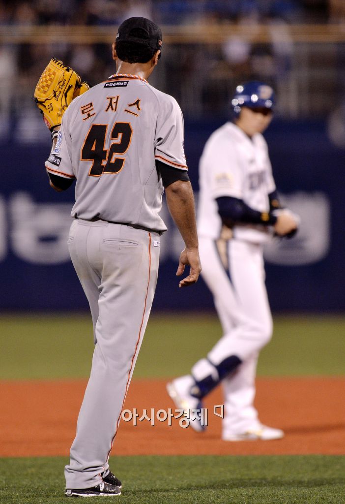 [창원=아시아경제 김현민 기자] 2015 KBO리그 한화 이글스와 NC 다이노스의 경기가 27일 마산야구장에서 열렸다. 한화 선발투수 로저스가 5회말 1사에서 우중간 2루타를 치고 출루한 NC 나성범에게 목례하고 있다. 김현민 기자 kimhyun81@asiae.co.kr<ⓒ세계를 보는 창 경제를 보는 눈, 아시아경제(www.asiae.co.kr) 무단전재 배포금지>