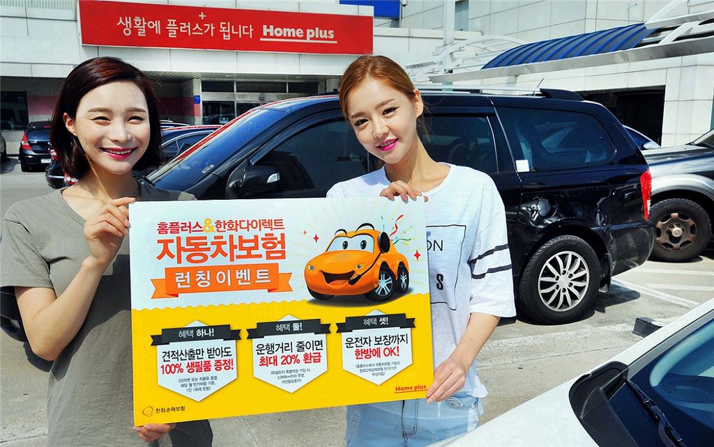 28일 홈플러스 영등포점에서 모델들이 홈플러스 한화다이렉트자동차보험 출시를 알리고 있다.