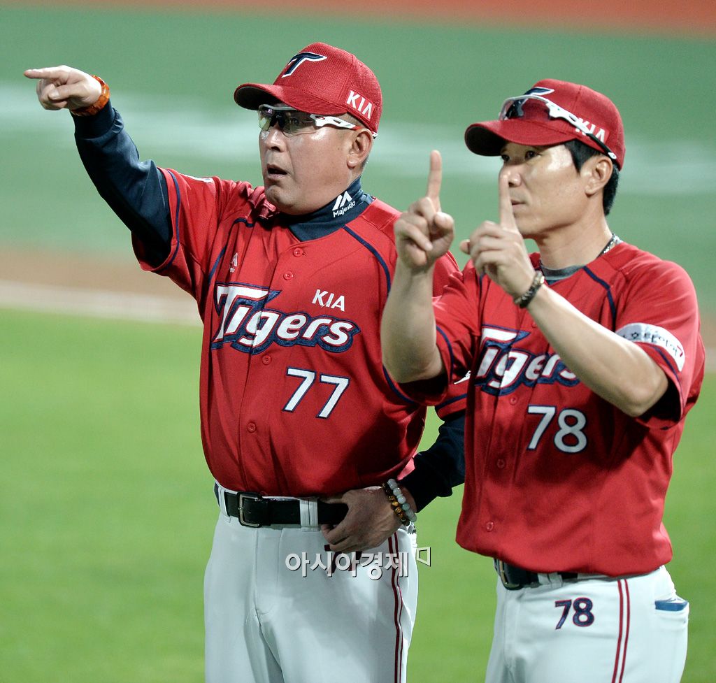 [수원=아시아경제 김현민 기자] 2015 KBO리그 KIA 타이거즈와 kt 위즈의 경기가 28일 수원야구장에서 열렸다. KIA 김기태 감독과 이대진 투수코치가 3회말 1사 2루에서 불펜을 향해 투수 교체 사인을 보내고 있다. 김현민 기자 kimhyun81@asiae.co.kr<ⓒ세계를 보는 창 경제를 보는 눈, 아시아경제(www.asiae.co.kr) 무단전재 배포금지>