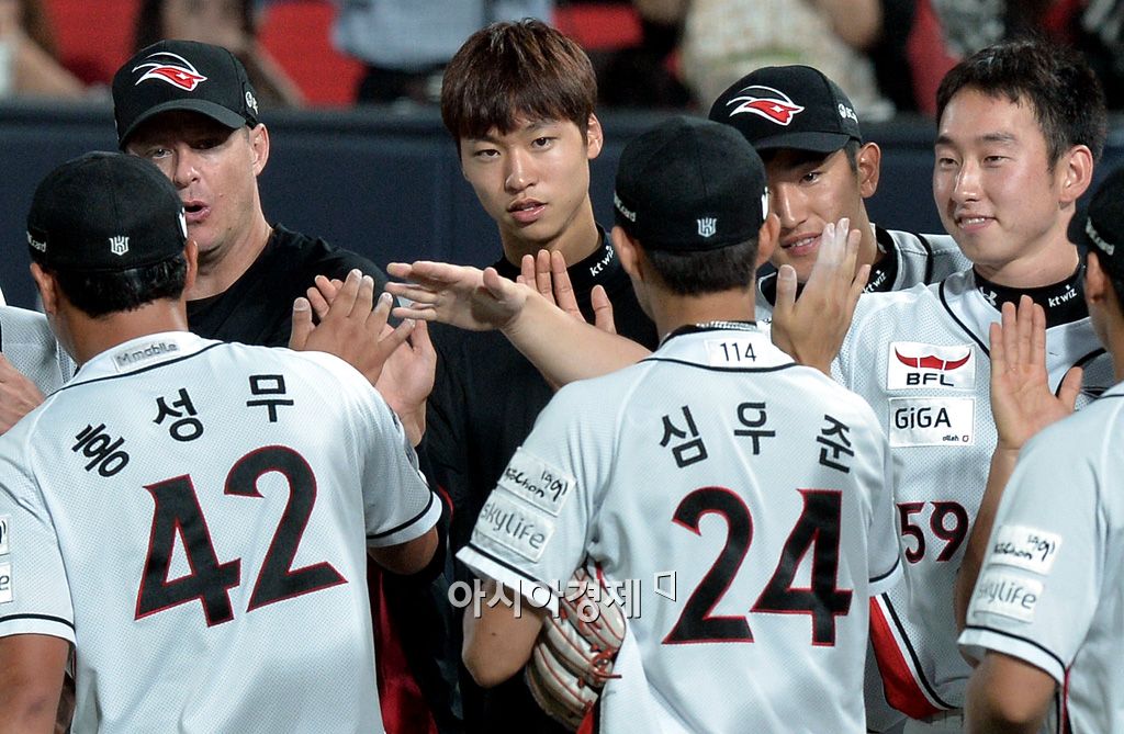 [수원=아시아경제 김현민 기자] 프로야구 kt 위즈가 28일 수원야구장에서 열린 2015 KBO리그 KIA 타이거즈와의 경기에서 10-0으로 이겼다. 7이닝 무실점으로 시즌 세 번째 승을 챙긴 선발 엄상백이 동료들과 기쁨을 나누고 있다. 김현민 기자 kimhyun81@asiae.co.kr<ⓒ세계를 보는 창 경제를 보는 눈, 아시아경제(www.asiae.co.kr) 무단전재 배포금지>