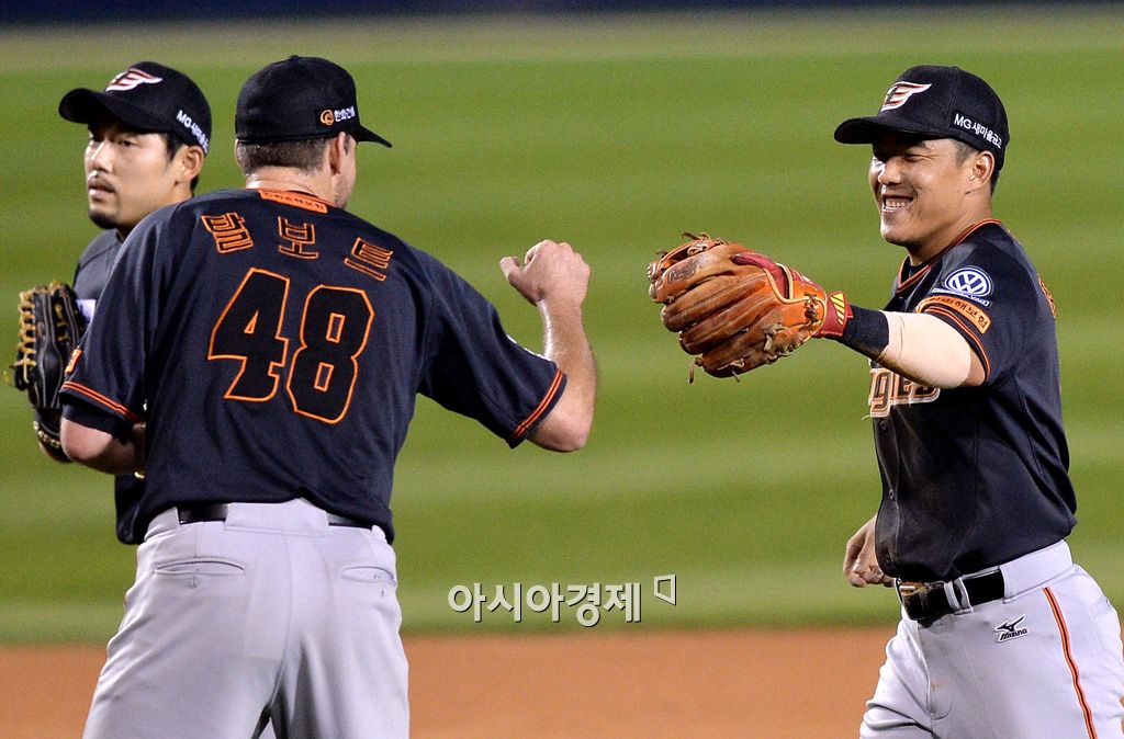 [잠실=아시아경제 김현민 기자] 2015 KBO리그 한화 이글스와 두산 베어스의 경기가 30일 잠실야구장에서 열렸다. 두산 선발 탈보트가 4회말 2사 1,3루에서 두산 김재호의 타구를 잡아 호수비한 정근우와 하이파이브하고 있다. 김현민 기자 kimhyun81@asiae.co.kr<ⓒ세계를 보는 창 경제를 보는 눈, 아시아경제(www.asiae.co.kr) 무단전재 배포금지>