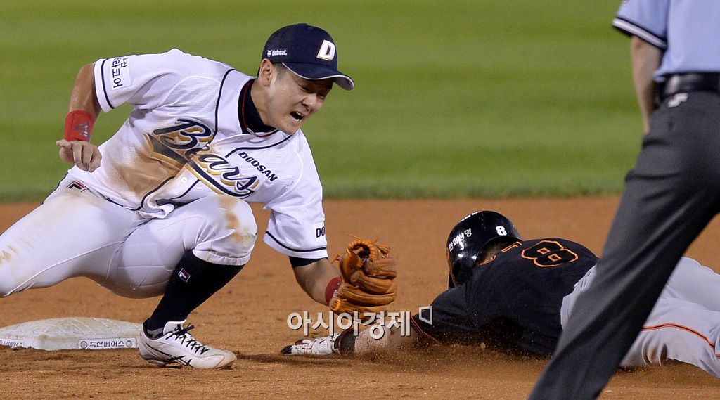 [잠실=아시아경제 김현민 기자] 2015 KBO리그 한화 이글스와 두산 베어스의 경기가 30일 잠실야구장에서 열렸다. 5회초 1사 1루에서 한화 김태균 타석 때 도루를 시도한 1루주자 정근우가 두산 최주환에게 태그아웃되고 있다. 김현민 기자 kimhyun81@asiae.co.kr<ⓒ세계를 보는 창 경제를 보는 눈, 아시아경제(www.asiae.co.kr) 무단전재 배포금지>
