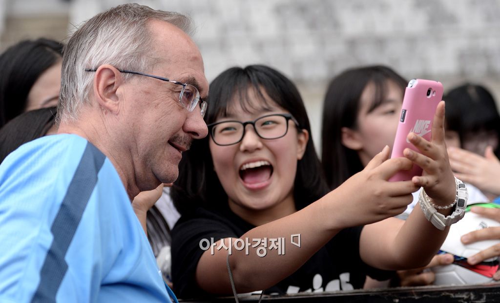 [화성=아시아경제 김현민 기자] 울리 슈틸리케 감독이 이끄는 축구 국가대표팀이 31일 화성종합경기타운에서 라오스와의 2018 러시아 월드컵 아시아지역 2차 예선을 앞두고 소집훈련을 가졌다. 훈련에 앞서 슈틸리케 감독이 소녀팬과 기념사진을 찍고 있다.김현민 기자 kimhyun81@asiae.co.kr<ⓒ세계를 보는 창 경제를 보는 눈, 아시아경제(www.asiae.co.kr) 무단전재 배포금지>