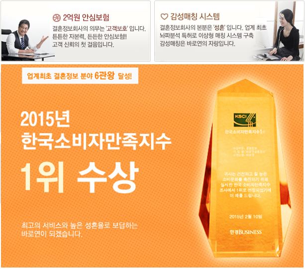 [아시아경제 최서연 기자] 결혼정보회사 바로연은 업계 최초로 현대해상 2억원 안심보험 가입과 함께 감성매칭기술을 도입해 고객을 보호하고 질 높은 서비스를 제공하겠다고 1일 밝혔다. 바로연의 보험 가입은 소비자 구제 목적도 있지만 궁극적으로는 보험처리 단계까지 가지 않고 성혼을 이루도록 하기 위해서다. 이는 회원 가입 단계부터 무분별한 입회를 막기 위한 것이다.또한 바로연은 수십 단계의 인증 및 검증을 거쳐 회원을 까다롭게 선발하고 있다. 대다수의 회원들이 전문직 및 노블레스회원들로 구성된 이유다. 바로연은 뇌파분석 감성매칭기술을 개발해 국내특허를 획득했고 해외특허도 출원 중이며 이를 통해 기업이 벤처인증도 받았다. 감성매칭은 과학적인 장비와 검사법을 통해 상대방의 외모 호감도, 음악, 영화, 음식 성향 등을 파악해 최적의 이상형을 찾을 수 있도록 돕는 것으로 단순히 서류상의 조건만 보고 매칭하는 방식과는 확연히 다르다. 바로연 관계자는 "많은 이들이 이상형은 말 그대로 이상형일 뿐, 현실에서는 눈높이를 낮춰야 한다고들 말하지만 바로연의 감성매칭시스템은 단순히 외적인 조건을 찾는 것이 아니라 내적인 취향까지 파악할 수 있다"며 "이상형을 찾는 것은 단순한 욕심이 아니라 선택의 기준이 되고 있다"고 설명했다. 최서연 기자 christine89@asiae.co.kr<ⓒ세계를 보는 창 경제를 보는 눈, 아시아경제(www.asiae.co.kr) 무단전재 배포금지>
