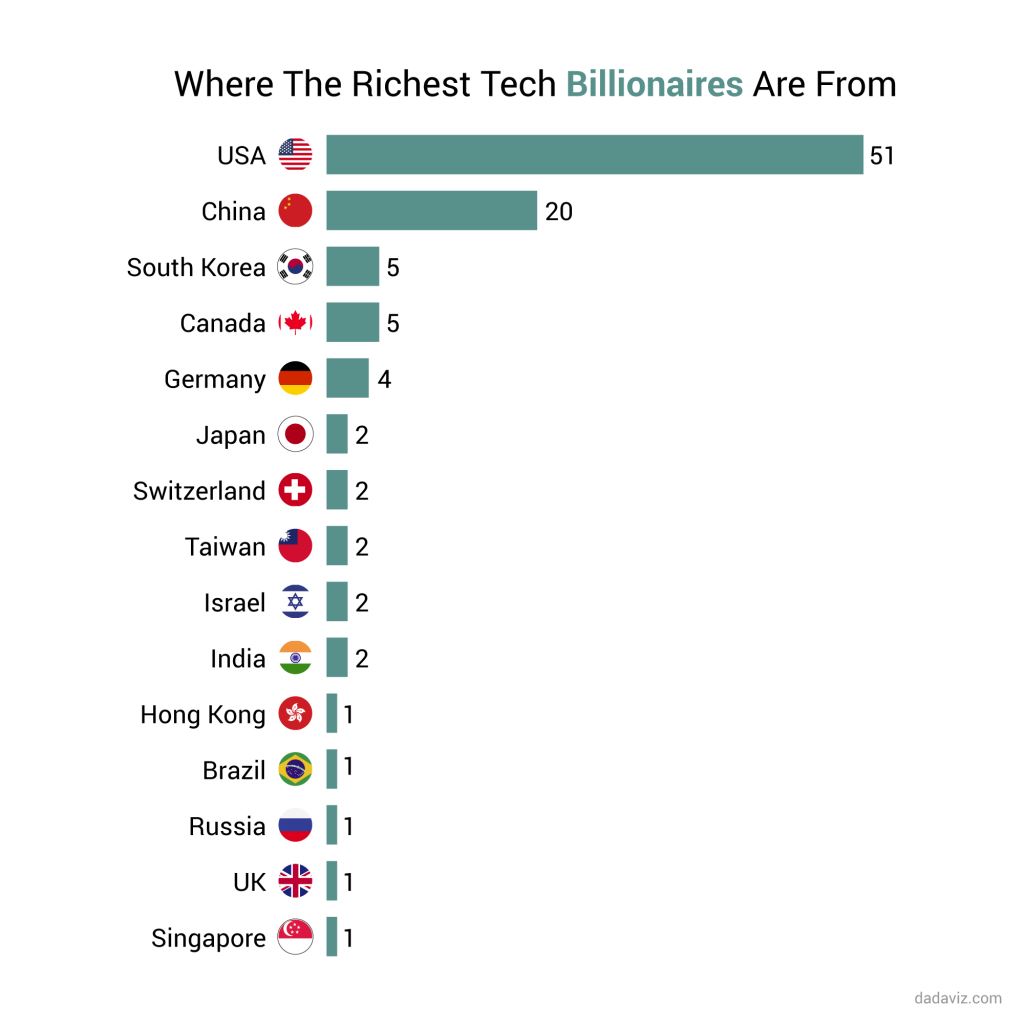 [아시아경제 권용민 기자] 미국 경제 전문 매체 비즈니스인사이더는 데이터베이스(DB) 분석 업체 다다비즈(Dadaviz)의 분석가 조디 시에라즈키가 만든 차트를 인용해 100대 IT 억만장자들의 수를 국가별로 1일(현지시간) 소개했다.조디 시에라즈키는 앞서 포브스가 선정한 올해의 100대 IT부자 리스트를 인용해 이같은 차트를 만들어냈다.데이터에 따르면 전 세계에서 IT 억만장자가 가장 많은 나라는 미국(51명)이었다. 비즈니스인사이더는 "미국이 큰 차이로 앞선 것은 그리 놀랄만한 일은 아니다"라고 평가했다. 이어 중국(20명), 한국·캐나다(5명), 독일(4명), 일본(2명) 순으로 나타났다.포브스가 선정한 국내 IT 억만장자는 ▲이건희 삼성그룹 회장 ▲이재용 삼성전자 부회장 ▲권혁빈 스마일게이트 대표 ▲김정주 NXC 회장 ▲김범수 다음카카오 이사회 의장 등 5명이다. 이건희 회장은 100억 달러(약 11조6670억원)의 재산으로 순위에 포함된 한국인 가운데 가장 높은 19위를 기록했다. 이재용 부회장은 재산 76억 달러(전체 순위 29위)로 그 뒤를 이었다. IT 억만장자 1위는 769억 달러 수준의 재산을 가진 빌 게이츠 마이크로소프트(MS) 창업자가 꼽혔다. 중국의 마윈 알리바바 회장은 재산 232억 달러로 전체 순위 7위를 기록했다. 마화텅 텐센트 회장(179억 달러, 11위), 레이쥔 샤오미 회장(134억 달러, 16위) 등도 이름을 올렸다.권용민 기자 festym@asiae.co.kr<ⓒ세계를 보는 창 경제를 보는 눈, 아시아경제(www.asiae.co.kr) 무단전재 배포금지>