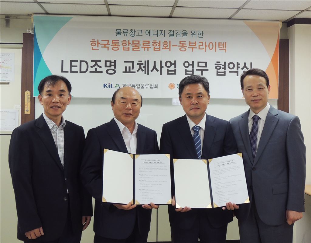 동부라이텍-한국물류협회 업무 협약식. 왼쪽부터 나재붕 한국통합물류협회 사무국장, 한덕식 한국통합물류협회 전무, 정대영 동부라이텍 영업마케팅본부장, 유영노 동부라이텍 국내사업부장. <br />