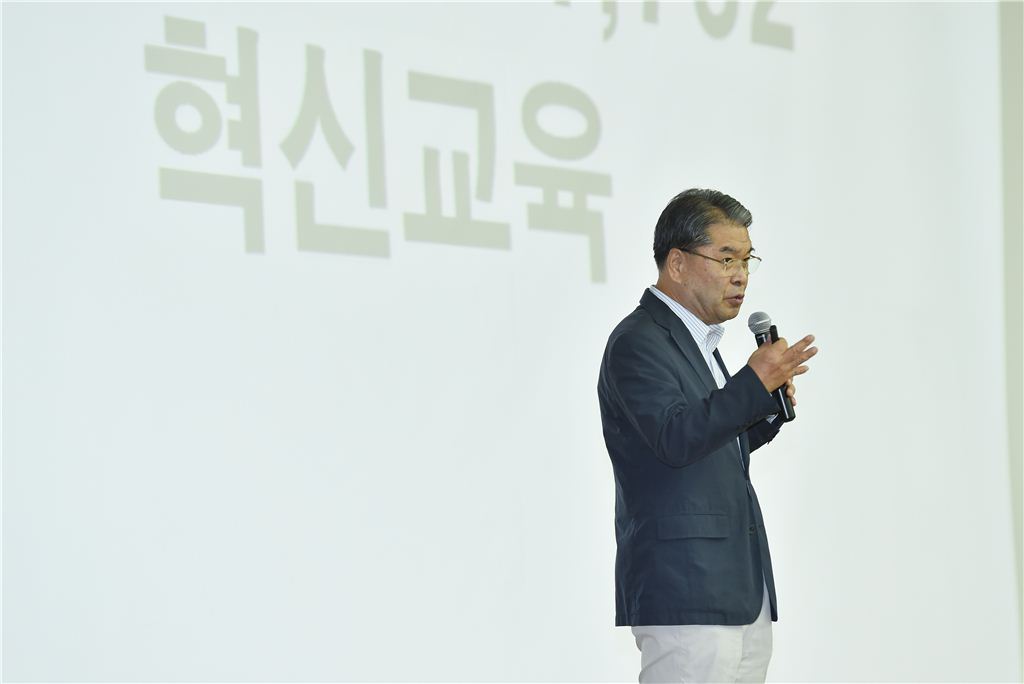 이재정 경기도교육감은 3일 경기도 이천시 장호원읍 경충대로 경기도교육연수원 으뜸홀에서 열린 '2015 하반기 간부직 교육행정 협의회'에 참석해 학생중심 현장중심 경기혁신교육의 새로운 도약을 강조했다. 이 교육감이 혁신교육은 경기교육의 꿈이고, 혁신교육은 틀, 제도, 정책이 아니라 선생님과 학생이 교실에서 직접 만들어가는 감동이라고 설명하고 있다. 또 교육행정 핵심 간부들이 변화를 만들어 가야하며, 모든 문제를 협의하고 협력하자고 당부했다.