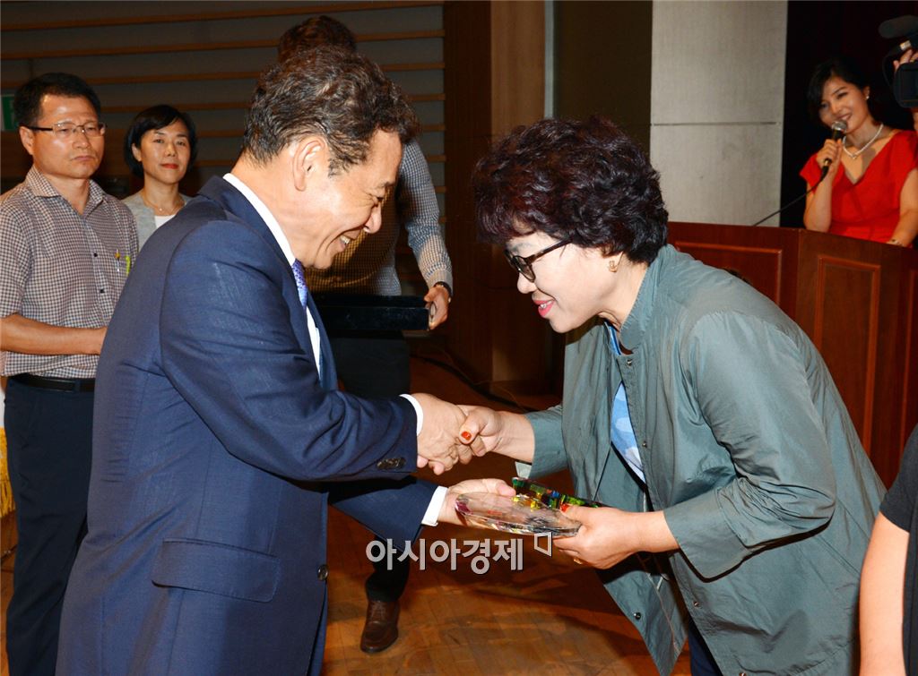 윤장현 광주광역시장은 3일 오후 시청 3층 대회의실에서 열린 첫 ‘양성평등주간’ 기념식에 참석해 양성평등 향상 유공자들에게 시상을 하고 있다.