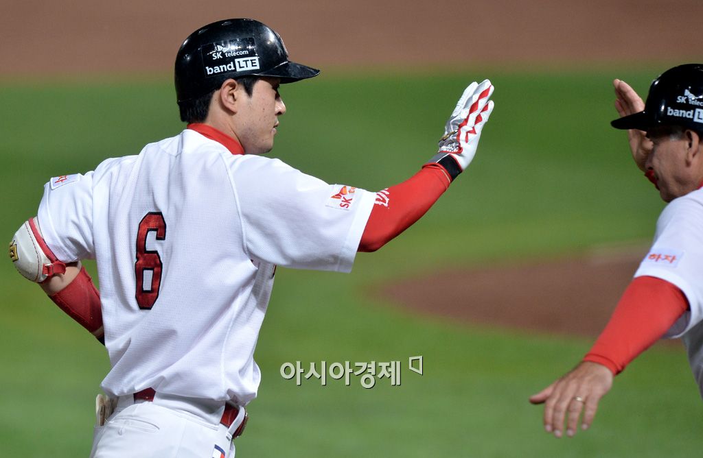 [인천=아시아경제 김현민 기자] 2015 KBO리그 삼성 라이온즈와 SK 와이번스의 경기가 4일 문학야구장에서 열렸다. 5회말 무사 1루에서 SK 김성현이 삼성 선발 클로이드를 상대로 추가 투런 홈런을 치고 알바레즈 코치와 하이파이브하고 있다. 김현민 기자 kimhyun81@asiae.co.kr<ⓒ세계를 보는 창 경제를 보는 눈, 아시아경제(www.asiae.co.kr) 무단전재 배포금지>