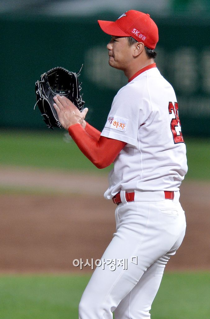 [인천=아시아경제 김현민 기자] 2015 KBO리그 삼성 라이온즈와 SK 와이번스의 경기가 4일 문학야구장에서 열렸다. SK 선발 김광현이 5회초 2사 1루에서 삼성 이지영을 유격수 땅볼로 처리한 뒤 박수를 치고 있다. 김현민 기자 kimhyun81@asiae.co.kr<ⓒ세계를 보는 창 경제를 보는 눈, 아시아경제(www.asiae.co.kr) 무단전재 배포금지>