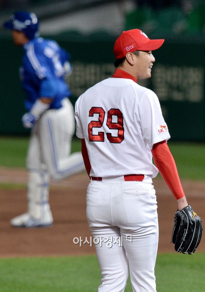 [인천=아시아경제 김현민 기자] 2015 KBO리그 삼성 라이온즈와 SK 와이번스의 경기가 4일 문학야구장에서 열렸다. SK 선발 김광현이 8회초 삼성 선두타자 이승엽에게 우월 솔로 홈런을 허용하고 있다. 김현민 기자 kimhyun81@asiae.co.kr<ⓒ세계를 보는 창 경제를 보는 눈, 아시아경제(www.asiae.co.kr) 무단전재 배포금지>
