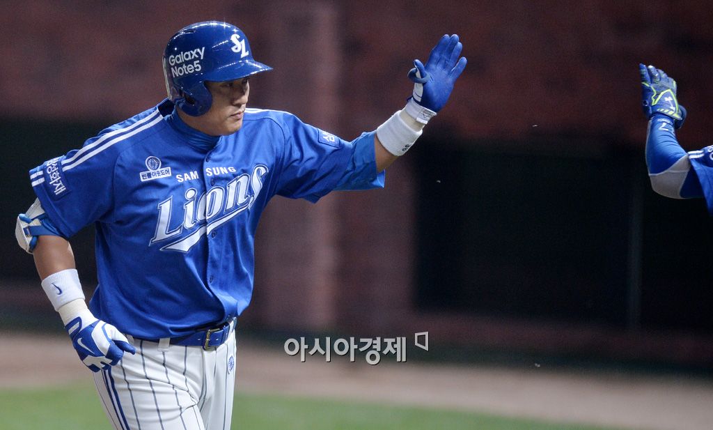 [인천=아시아경제 김현민 기자] 2015 KBO리그 삼성 라이온즈와 SK 와이번스의 경기가 4일 문학야구장에서 열렸다. 8회초 삼성 선두타자 이승엽이 SK 선발 김광현을 상대로 우월 솔로 홈런을 치고 대기타석의 채태인과 하이파이브하고 있다. 김현민 기자 kimhyun81@asiae.co.kr<ⓒ세계를 보는 창 경제를 보는 눈, 아시아경제(www.asiae.co.kr) 무단전재 배포금지>