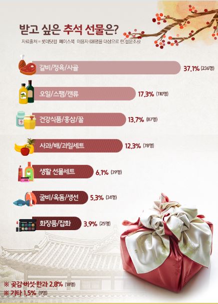 본 설문조사는 ‘가장 받고 싶은 추석 선물은?’ 조사도 함께 진행됐다. 그 결과 ‘갈비·정육·사골’이 올 추석 가장 받고 싶은 선물 1위 37.1%(236명)에 올랐다. 이어 ‘오일·스팸·캔류’가 약 17.3%(110명)의 선택을 받아 2위를, ‘건강식품·홍삼·꿀’도 약 13.7%에 해당하는 87명이 추천해 3위를 차지했다. 응답자의 약 12.3%(78명)가 선택한 ‘사과·배·과일세트’의 경우 4위를, 6.1%(39명)를 차지한 ‘생활선물세트’는 5위를 차지했다. 6위는 5.3%(34명)가 선택한 ‘굴비·옥돔·생선세트’이며, 7위는 3.9%(25명) ‘화장품?잡화’, 8위는 2.8%(18명)이 선택한 ‘곶감?버섯?한과’, ‘기타’ 1.5%(9명) 순으로 집계됐다. 이초희 기자 cho77love@asiae.co.kr<ⓒ세계를 보는 창 경제를 보는 눈, 아시아경제(www.asiae.co.kr) 무단전재 배포금지>