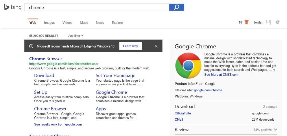 윈도우 10 이용자가 MS의 검색엔진 '빙(bing)'에서 크롬을 검색하면 검은색 창에 '엣지 브라우저'를 추천한다는 별도의 안내 창이 뜬다. (사진 출처 : 벤처비트)