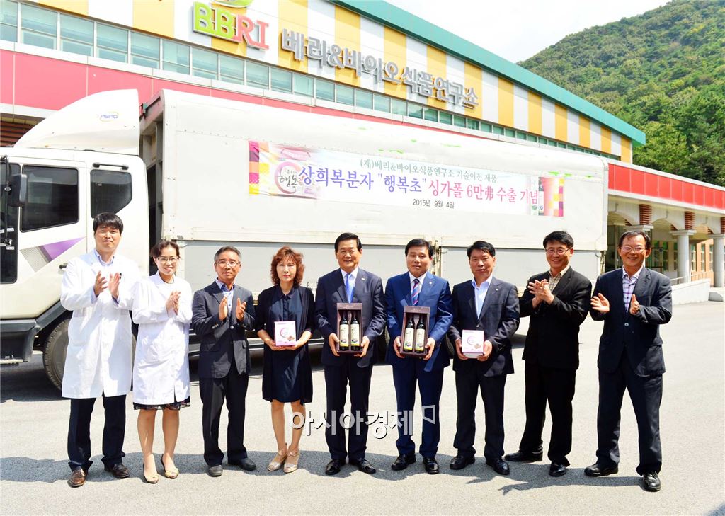 (재)베리&바이오식품연구소(이사장 박우정 고창군수)와 고창상희복분자영농조합법인(대표 안문규)이 R&D사업을 통해 공동으로 개발한 복분자식초(행복초)가 싱가폴에 수출된다. <br />