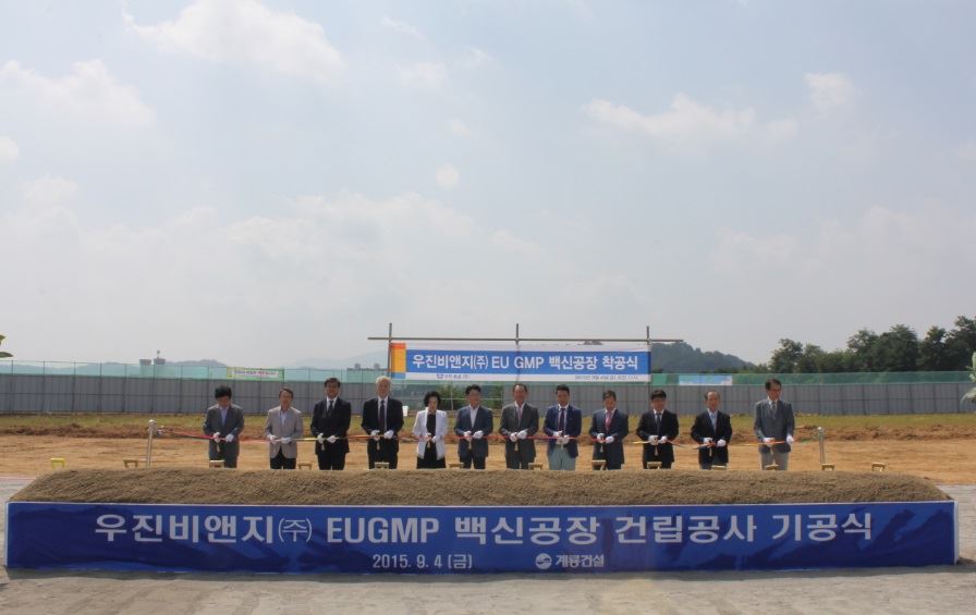 강재구 우진비앤지 대표(오른쪽 다섯번째) 등 관계자들이 백신공장 기공식에서 기념촬영하고 있다.