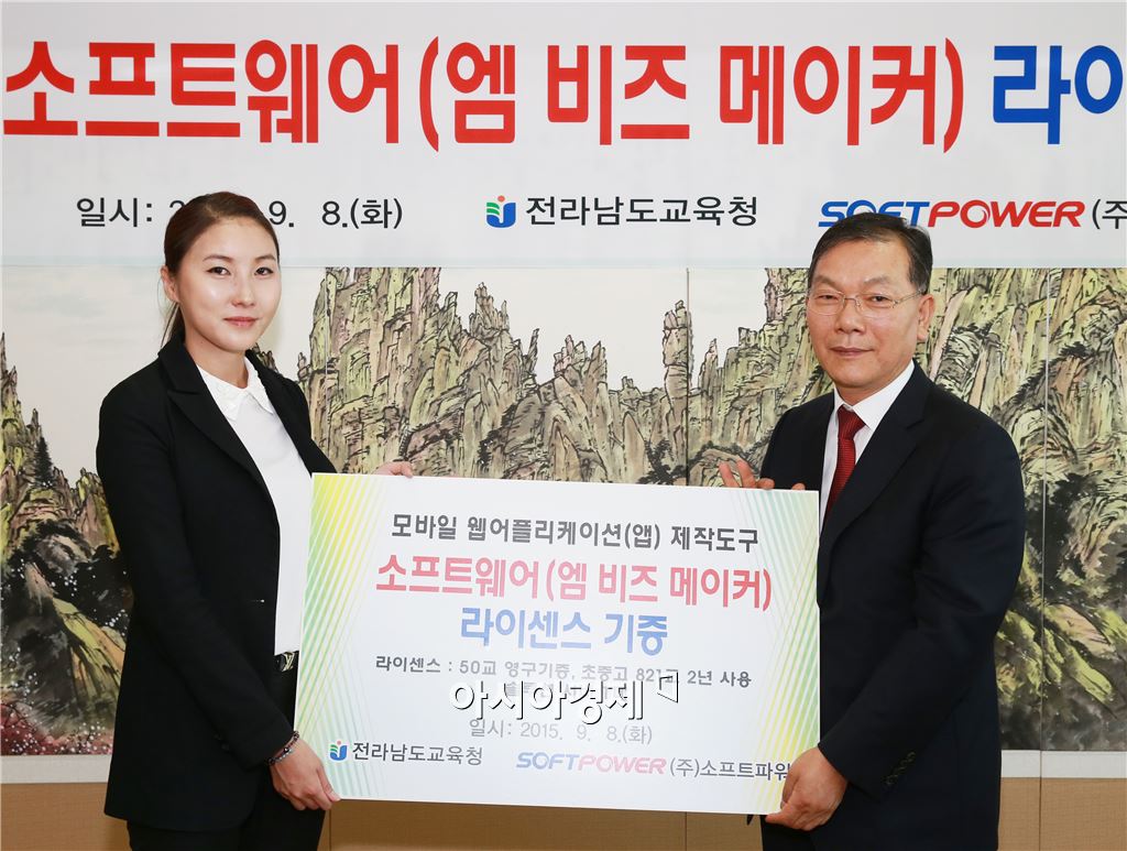 전남도교육청(교육감 장만채)은 8일 ㈜소프트파워(대표 김수랑)가 소프트웨어교육 활성화를 위해 모바일 웹어플리케이션(앱) 제작도구인 소프트웨어 엠-비즈메이커 솔루션을 기증했다. <br />