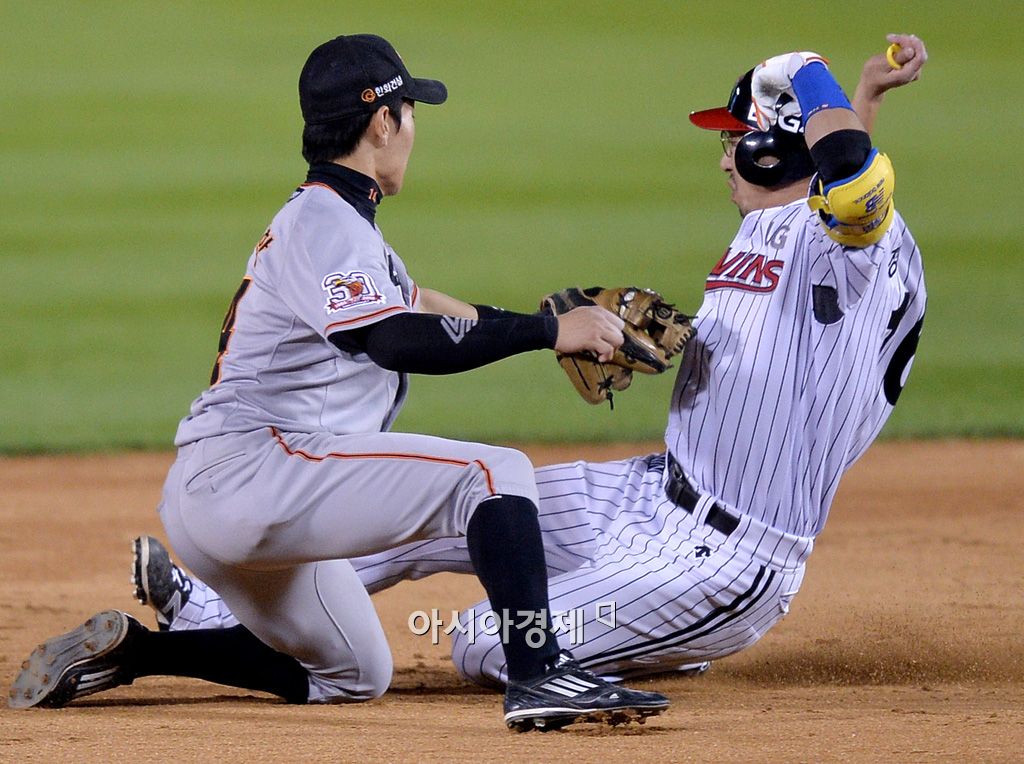 [잠실=아시아경제 김현민 기자] 2015 KBO리그 한화 이글스와 LG 트윈스의 경기가 8일 잠실야구장에서 열렸다. 5회말 무사 2루에서 LG 정성훈이 1타점 적시타를 치고 2루까지 진루하다 한화 유격수 강경학에게 태그아웃되고 있다. 김현민 기자 kimhyun81@asiae.co.kr<ⓒ세계를 보는 창 경제를 보는 눈, 아시아경제(www.asiae.co.kr) 무단전재 배포금지>