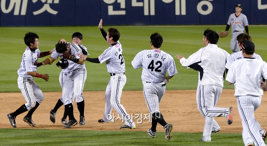 [잠실=아시아경제 김현민 기자] 프로야구 LG 트윈스가 8일 잠실 야구장에서 열린 2015 KBO리그 한화 이글스와의 경기에서 시즌 최장시간(5시간 25분) 경기 끝에 8-7로 이겼다. 연장 12회말 2사 2루에서 LG 박지규가 끝내기 안타를 치고 동료들과 기쁨을 나누고 있다.김현민 기자 kimhyun81@asiae.co.kr<ⓒ세계를 보는 창 경제를 보는 눈, 아시아경제(www.asiae.co.kr) 무단전재 배포금지>