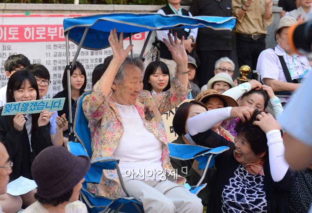 [아시아경제 백소아 기자] 9일 서울 종로구 일본대사관 앞에서 열린 제1195차 일본군 위안부 문제해결을 위한 수요집회에서 길원옥 할머니가 참가자들을 향해 인사하고 있다.백소아 기자 sharp2046@asiae.co.kr<ⓒ세계를 보는 창 경제를 보는 눈, 아시아경제(www.asiae.co.kr) 무단전재 배포금지>