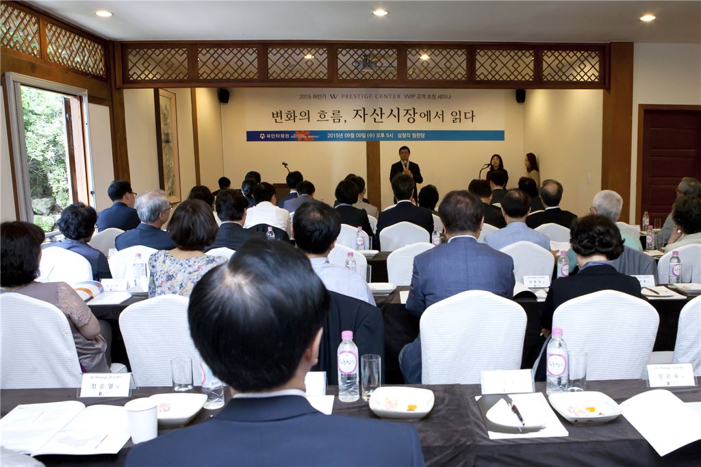 [아시아경제 조유진 기자] 유안타증권은 9일 서울 삼청각 청천당에서 '변화의 흐름, 자산시장에서 읽다'라는 주제로 W프레스티지센터의 우수고객을 초청해 VVIP세미나를 개최했다. 유안타증권은 이번 세미나를 통해 최근 변동성이 확대되고 있는 글로벌 금융시장과 부동산정책·세법개정안 등 자산시장의 변화를 긴급 점검해 보는 시간을 가졌다. 첫 강연자로 나선 박기현 유안타증권 리서치센터장은 '공포의 이면을 보자'라는 주제로 최근 금융시장의 움직임을 분석했다. 그는 미국의 금리인상, 중국의 경기침체로 촉발된 금융시장의 변동성 확대 구간에서도 시장변화의 시점과 투자기회를 포착할 수 있음을 강조하면서 이익사이클 및 시중 유동성 증가 국면에서의 핵심투자전략을 제시했다.특히 이날 행사에는 최근 뜨거운 부동산시장 열기를 반영해 한국건설산업연구원 건설경제연구실 김현아 실장을 초빙해 정부의 부동산정책 방향성과 그에 따른 자산관리전략을 들어봤다. 김 실장은 이 자리에서 글로벌 금융위기 이후 저금리, 고령화 추세에 따라 나타난 국내 부동산시장의 패러다임 변화를 강조하면서 부동산자산을 바라보는 시각의 변화를 요구했다. 마지막 순서로 유안타증권 PB지원팀 금융분야 전문 김철훈 세무사가 최근 거액자산가들이 직면한 주요 세무이슈와 그에 따른 대응전략에 대해 강연했다. 재산세제와 금융관련 필수 유의사항은 물론 2015 세법개정안 주요 내용을 통해 유비무환의 절세전략을 소개했다. 본 강연에 앞서 황웨이청 사장은 환영사를 통해 "유안타증권은 그 어느 때, 그 누구보다도 고객분들의 자산관리에 총력을 기울이고 있다"며 "우리 역할은 양질의 투자정보를 찾아내는 것이며 그 기회를 누구보다 먼저 우리 고객님들께 알려드릴 것이다"고 말했다. 서명석 사장도 강연 후 이어진 전통공연 및 만찬에서 "유안타증권의 동반자로 변함없이 함께 해주시는 고객분들께 깊은 감사의 말씀을 드린다"며 "고객을 가장 중요시하고 고객을 위해 활동하는 가장 모범적인 증권사가 되도록 노력하겠다"고 약속했다. 한편 유안타증권은 우수고객 대상 차별화된 서비스의 일환으로 국내 최대 미술품 경매 전시장 관람 이벤트를 개최한다. 오는 11일 서울 서울옥션 전시관에서 우수고객 등을 초청해 '글로벌 시장이 주목하는 한국미술의 이해'라는 주제로 올해 미술시장 동향을 짚어보고, 수석경매사와 전문 스페셜리스트가 주관하는 근현대 미술품 경매를 참관한 후 미니경매도 진행할 예정이다.