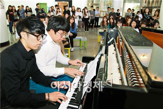 광주대학교(총장 김혁종) 문화예술대학 음악학과(학과장 김정아)는 10일 호심관 1층 로비에서 힐링콘서트를 개최했다. 점심시간대를 이용해 열린 이날 힐링콘서트에서는 피아노 전공 학생들이 방학동안 연습한 피아노앙상블을 연주, 교직원과 학생들부터 좋은 반응을 얻었다.<br /> <br /> <br /> <br /> 이날 공연에는 두 대의 피아노에서 4명이 함께 연주한 론도와 왈츠, 한 대의 피아노에 4명씩 모두 8명이 함께 한 젓가락행진곡과 캐논, 영화 ‘사운드 오브 뮤직’ 의 에델바이스와 도레미송 등이 연주됐다.<br />