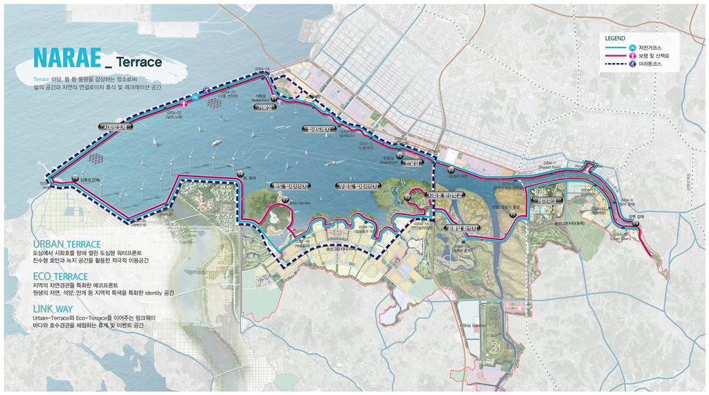 [아시아경제 김종화 기자] 케이워터는 11일 시화호 수변구역을 따라 65km에 달하는 시화나래 둘레길을 조성하고, 이를 시화호 워터프론트(Waterfront)로 특화하는 '시화나래길 종합마스터플랜'을 수립했다고 밝혔다.워터프론트(Waterfront)란 물과 맞닿는 지역의 수변공간을 말하는데 세계적으로 호주의 골드코스트, 미국 캘리포니아 샌프란시스코 해변 등이 유명하다. 시화나래란 의미는 "날개를 펼치듯 널리 알려지고 솟아오르다"는 뜻으로 지난해 10월 케이워터가 공모를 통해 선정한 시화지구의 글로벌 명칭이다.시화나래길 종합마스트플랜에 따르면 우선 시화호의 경관을 감상하고 친수공간을 연결하는 폭 5m의 수변 자전거도로와 보행로 65km가 조성되고, 바다와 시화호를 보면서 달리는 42km의 국제 마라톤 코스도 조성된다.갈대습지, 철새도래지, 물안개 등 자연경관을 테마로 한 워터프론트 특화 공간, 자전거 이용객과 보행자를 위한 각종 휴식장소와 커뮤니티 공간도 더불어 조성된다. 시화방조제 체절이후 환경오염의 대명사로 불렸던 시화호의 변화된 모습과 관광자원으로서의 수변가치를 느낄 수 있는 서해안의 지역명소로 거듭나게 된다.케이워터는 시화나래길 조성 이후 이용 활성화를 위해 안산시, 화성시, 시흥시와 통합 공용자전거시스템을 구축해 출발지점과 종착지점을 특화하고 완주 인증 프로그램도 마련한다.또 단계적으로 국제 마라톤 대회, 철새탐조 투어, 캠핑대회, 환경영화제 등 다채로운 문화관광행사도 개최할 계획이다.'시화나래길 종합마스터플랜'이 확정되면서 10월부터 시화호 북측 간석지에 조성될 멀티테크노밸리(MTV) 구간부터 시화나래길을 만들기 시작해 송산그린시티개발사업이 준공되는 2022년에 완공될 예정이다. 서을성 케이워터 수변사업본부장은 "시화나래길은 시화조력발전소, 갈대습지공원, 공룡알화석지, 대부도, 오이도 등 시화호 주변의 풍부한 관광자원과 함께 서해안의 또 다른 관광명소가 될 것"이라고 강조했다. 김종화 기자 justin@asiae.co.kr<ⓒ세계를 보는 창 경제를 보는 눈, 아시아경제(www.asiae.co.kr) 무단전재 배포금지>