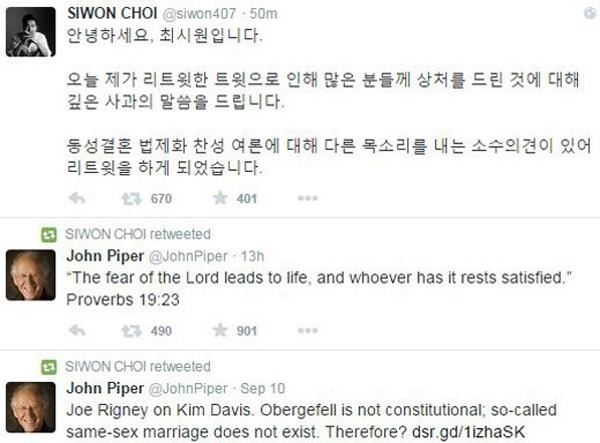 [아시아경제 온라인이슈팀]드라마 '그녀는 예뻤다'에 출연 예정인 그룹 슈퍼주니어의 최시원이 동성결혼 법제화를 반대하는 글을 리트윗해 논란이 되자 사과 했다.11일 최시원은 동성결혼 법제화에 반대하는 내용을 담은 존 파이어 목사의 글을 리트윗한 바 있다. 해당 존 파이어 목사의 글은 당시 미국 연방대법원의 동성결혼 합법화 판결에 대해 "명백한 죄인 동성애를 승인하고 제도화해 주었다"는 내용이 포함되어 있다. 이에 논란이 일자 12일 최시원은 자신의 트위터를 통해 장문의 사과문을 게재했다. 최시원은 "오늘 제가 리트윗한 트윗으로 인해 많은 분들께 상처를 드린 것에 대해 깊은 사과의 말씀을 드린다"며 "동성결혼 법제화 찬성 여론에 대해 다른 목소리를 내는 소수의견이 있어 리트윗을 하게 되었다"고 전했다. 이어 "단순히 소수의견에 대한 문제가 아니라는 것을 뒤늦게 깨닫게 되었다. 저의 경솔했던 리트윗으로 인해 많은 분들께 상처를 드렸다"며 "앞으로도 더 소통 하며 배우고 싶다"고 사과 말을 전했다. 한편 최시원이 출연하는 '그녀는 예뻤다'는 MBC 수목드라마 '밤을 걷는 선비' 후속으로 오는 16일 첫 방송된다.온라인이슈팀 issue@asiae.co.kr<ⓒ세계를 보는 창 경제를 보는 눈, 아시아경제(www.asiae.co.kr) 무단전재 배포금지>