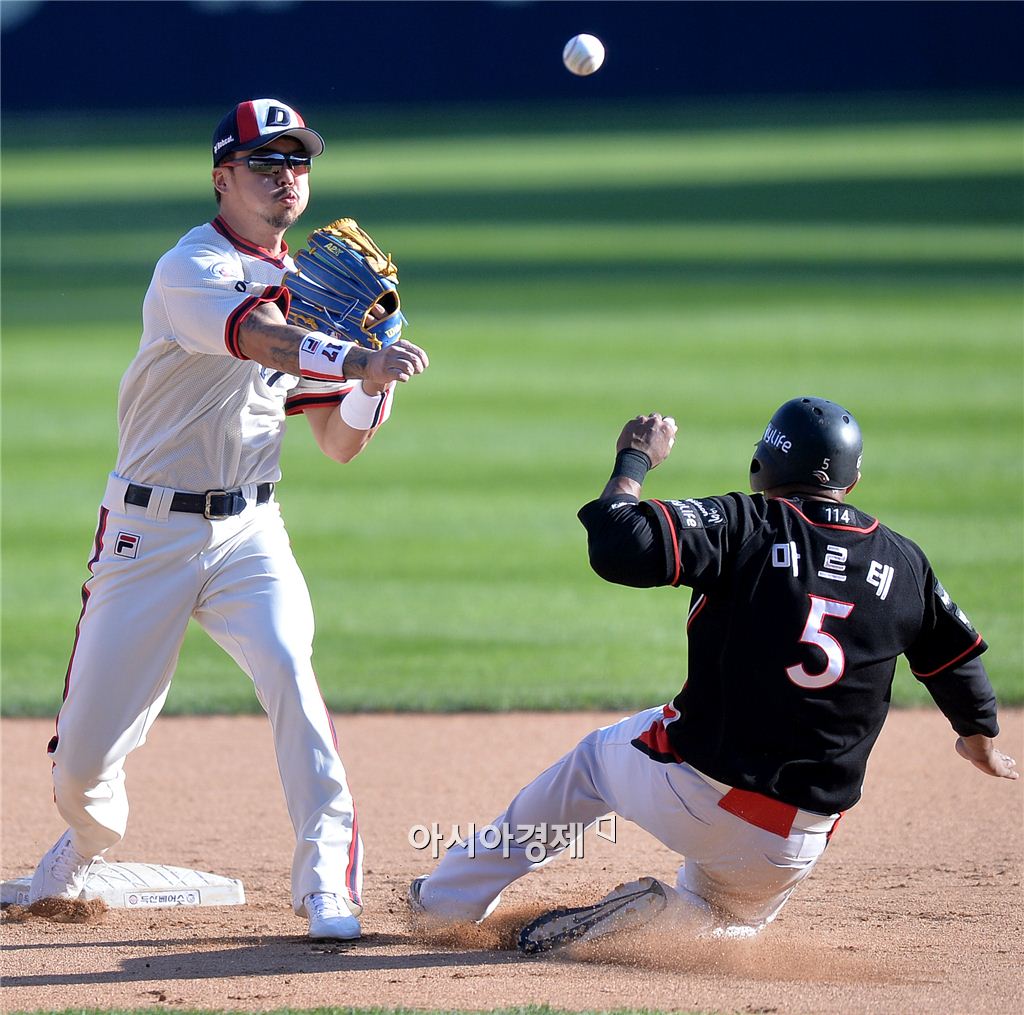[잠실=아시아경제 김현민 기자] 2015 KBO리그 kt 위즈와 두산 베어스의 경기가 13일 잠실야구장에서 열렸다. 7회초 1사 1,3루에서 두산 2루수 오재원이 kt 댄블랙의 유격수 땅볼 때 1루주자 마르테를 포스아웃시키고 1루로 송구하고 있다. 결과는 아웃, 병살타.김현민 기자 kimhyun81@asiae.co.kr<ⓒ세계를 보는 창 경제를 보는 눈, 아시아경제(www.asiae.co.kr) 무단전재 배포금지>