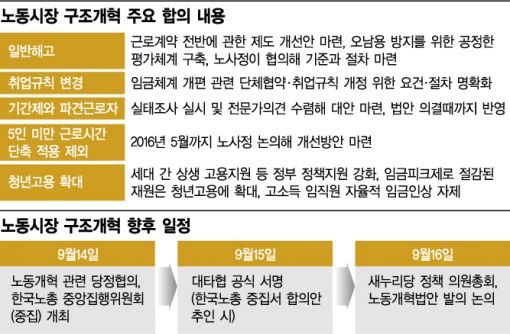 [아시아경제 조슬기나 기자, 이민찬 기자]노사정이 노동시장 개혁을 위한 대타협에 극적 합의라는 성과를 이뤘지만 아직 갈 길은 멀다. 이번 합의문에는 이른바 쉬운 해고로 요약되는 '일반해고 기준 명확화'와 '취업규칙 변경 완화' 등 주요 쟁점이 모두 포함됐다. 그러나 구체적 내용을 살펴보면 이견을 좁히기보다 추후 협의해나가기로 '미룬' 수준이라, '반쪽 타협'이라는 비판이 불가피하다. 건건 마다 노사정이 충돌할 수 있는 갈등의 불씨를 남긴 셈이다. 14일 노사정에 따르면 한국노총은 이날 오후 중앙집행위원회(중집)를 열고 '노동시장 구조개선을 위한 노사정 합의문(안)'에 대해 추인 여부를 결정한다. 합의문이 승인되면 노사정은 15일 최종 서명식을 진행할 예정이다. 작년 9월 노동시장 구조개선 특위를 출범하며 노동개혁 논의를 본격화한 지 약 1년만의 성과다. 이기권 고용노동부 장관은 "이제 첫 걸음을 뗐다"고 말했다.