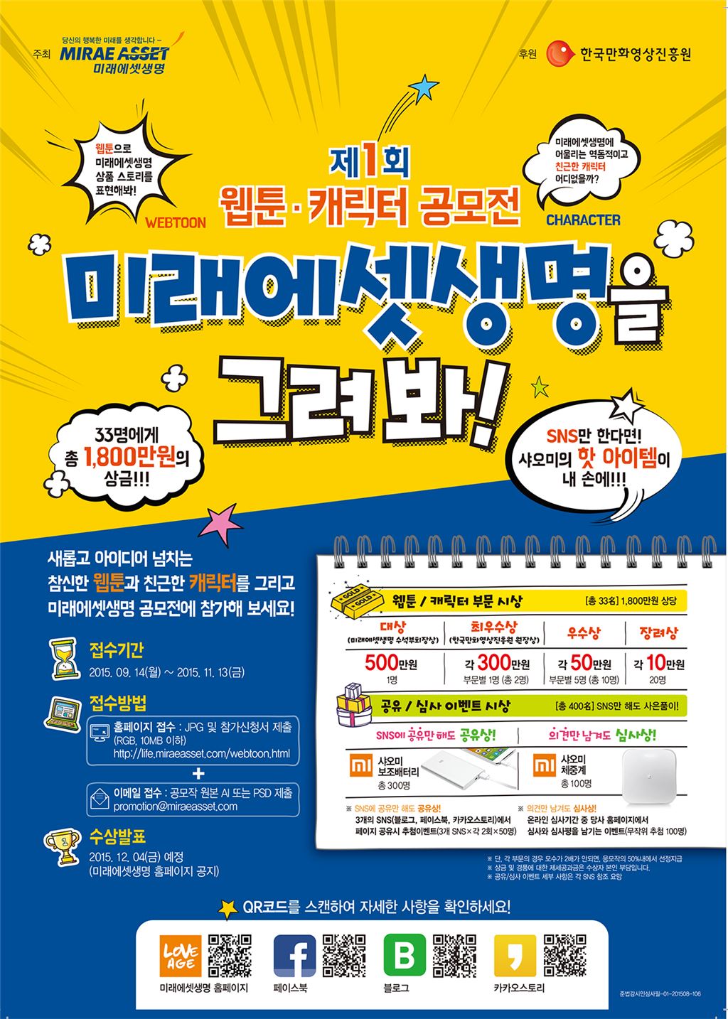 [아시아경제 김대섭 기자] 미래에셋생명이 내달 13일까지 '제1회 웹툰 캐릭터 공모전' 참가접수를 받는다. 이번 행사는 한국만화영상진흥원의 후원을 받아 웹툰과 캐릭터 두 부문으로 나눠서 진행된다. 웹툰 부문은 미래에셋생명의 대표 상품 5종을 스토리텔링해 만화로 표현하고, 캐릭터 부문은 자사 슬로건을 참고해 미래에셋생명과 가장 어울리는 캐릭터를 제작하면 된다. 대상(미래에셋생명 수석부회장상) 1명에게는 상금 500만원, 최우수상(한국만화영상진흥원 원장상) 2명에게는 각각 상금 300만원이 수여된다. 접수는 홈페이지 (life.miraeasset.com) 및 이메일(promotion@miraeasset.com)을 통해 받는다. 수상자는 올해 12월4일 미래에셋생명 홈페이지를 통해 공지할 예정이다. 미래에셋생명 관계자는 "웹툰과 캐릭터를 통해 고객에게 더욱 쉽게 미래에셋생명의 스토리를 전달하고 만화창조 문화의 활성화를 위해 공모전을 기획했다"고 말했다.김대섭 기자 joas11@asiae.co.kr<ⓒ세계를 보는 창 경제를 보는 눈, 아시아경제(www.asiae.co.kr) 무단전재 배포금지>