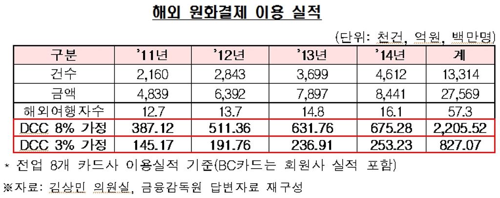 [아시아경제 이은정 기자] 카드 이용자가 해외에서 원화결제로 해외가맹점 등에(공급사 및 매입사 포함) 납부한 수수료가 최근 4년간(2011년∼2014년까지) 최대 2206억에 달하는 것으로 나타났다. 국회 정무위원회 소속 새누리당 김상민 의원은 15일 "해외에서 원화결제시 3~8% 해외원화결제서비스(DCC, Dynamic Currency Conversion) 수수료가 부과되나, 카드사들이 고객안내를 제대로 하지 않아 해외에서 과다 수수료를 냈다"며 이같이 밝혔다. DCC는 국내 카드 회원이 해외에서 카드를 이용할 때 이용 시점의 환율로 환산한 원화로 대금을 결제할 수 있도록 한 서비스다. 김 의원은 "최근 4년간 해외 원화결제 금액이 2조7569억원임을 감안할 때, 최대 8%에서 3%까지 적용되는 DCC수수료를 가정해 계산해보면 최대 2206억원에서 827억원을 해외가맹점 등에 기부한 것으로 추정된다"고 지적했다.DCC서비스를 선택할 경우 3∼8%의 DCC수수료 및 환전수수료가 부과돼 총 5∼10%의 추가 비용을 지불하게 된다는 것도 문제다. 만약 해외에서 1000달러(1달러=1000원가정)의 물품 구매시 DCC서비스를 이용할 경우 DCC수수료 5%에 환전수수료 1% 등을 포함해 총 108만1920원을 결제해야 한다. 이는 현지통화청구금액(101만원)보다 7.1% 더 비싼 금액이다. 김 의원은 "금감원이 올 한해에만 각 카드사들에게 수차례 공문을 발송해 원화결제시 높은 수수료가 부과된다는 점을 성실히 알릴 것을 주문했지만 카드사들의 조치는 상당히 미흡했다"며 "안내의무를 성실히 이행하지 않은 카드사들에게 조치를 취해야한다"고 주문했다. 또 "장기적으로는 카드사들이 관련부처인 외교부와 출입국관리소 및 통신사와 연계해 해외출국시 자동으로 문자 메시지를 통해 현지통화결제가 유리하다는 점을 안내토록 제도 개선을 취해야 한다"고 주장했다. 이은정 기자 mybang21@asiae.co.kr<ⓒ세계를 보는 창 경제를 보는 눈, 아시아경제(www.asiae.co.kr) 무단전재 배포금지>이은정 기자 mybang21@asiae.co.kr<ⓒ아시아 대표 석간 '아시아경제' (www.newsva.co.kr) 무단전재 배포금지>