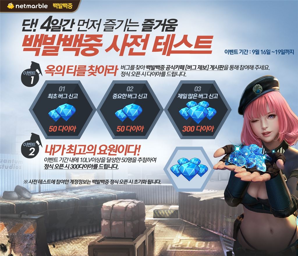 [아시아경제 안하늘 기자] 넷마블게임즈는 캐주얼 모바일 슈팅게임 '백발백중 for Kakao'의 사전 테스트를 19일까지 진행한다고 16일 밝혔다.테스트에 참가하길 원하는 게이머는 사전예약 페이지(//nes.netmarble.net/event/wefire/73)를 통해 게임을 다운로드 받으면 된다. 이번 테스트는 안드로이드에서만 진행된다.넷마블은 이번 테스트를 통해 '백발백중'의 모든 콘텐츠를 공개한다. 테스트에 참여한 계정정보는 정식 오픈 시 초기화된다.넷마블은 테스트 기간 10레벨까지 달성한 이에게 추첨을 통해 출시 후 사용할 수 있는 300다이아(게임재화)를 지급한다. 아울러, 게임 내 버그를 제보한 이용자에게도 최대 300 다이아를 제공한다.아울러, 넷마블은 영구 사용할 수 있는 총기 아이템과 게임재화를 증정하는 사전예약 프로모션을 출시 전까지 실시한다. 이외에도 지인에게 '백발백중'을 알리면 추천 수에 따라 최대 5만원 상당의 혜택을 제공하고, 사전예약 페이지에서 게임에 대한 기대평을 남긴 30명에게도 게임재화를 준다.'백발백중'에 대한 자세한 정보는 사전예약 페이지(//nes.netmarble.net/event/wefire/73)와 공식카페(//cafe.naver.com/100shots100hits)에서 확인할 수 있다.안하늘 기자 ahn708@asiae.co.kr<ⓒ세계를 보는 창 경제를 보는 눈, 아시아경제(www.asiae.co.kr) 무단전재 배포금지>
