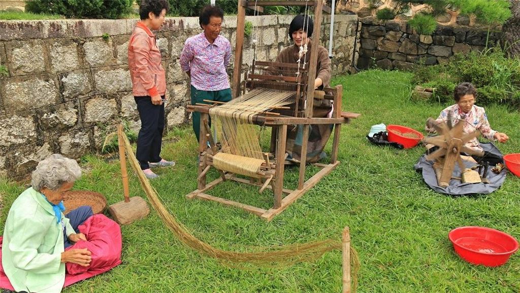 [태백산맥문학관이 마련한 '죽산댁과 함께 삼베짜기 및 연향차 체험 행사'에서 전통의 삼베짜기가 시연되고 있다.]