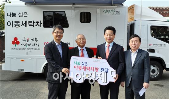 전라남도자원봉사센터(이사장 최상준)는 18일 영암 군서면 동호마을에서 ‘나눔 실은 이동세탁차량 전달식 및 자원봉사활동’을 실시했다.<br />