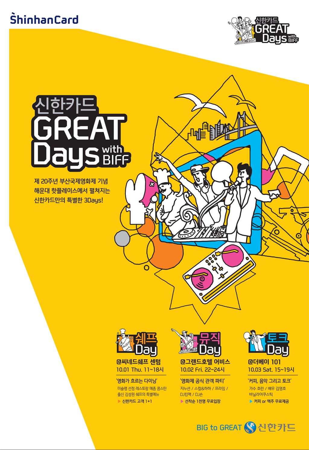 [아시아경제 이현주 기자] 신한카드는 제20회 부산국제영화제를 맞아 영화제를 찾은 관객을 위한 다양한 이벤트를 선보인다고 21일 밝혔다. 신한카드는 올해 '2015 GREAT Days with BIFF'라는 타이틀 아래 3일 동안 요리, 파티, 토크 등 다양한 컨텐츠를 통해 2030세대 관객들과 소통할 예정이다. 신한카드는 부산국제영화제 공식 스폰서다.먼저, 개막식이 열리는 10월 1일에는 고품격 레스토랑 씨네드쉐프 센텀점에서 미슐랭 선정 레스토랑 '메종 콩스탄' 출신의 김성원 쉐프와 함께 영화 속 요리를 즐길 수 있는 '쉐프데이'를 진행한다. 오전 11시부터 저녁 6시까지 영화 '엘리제궁의 요리사'를 모티브로 한 신한카드 스페셜 메뉴를 선보이며 신한카드 결제 시 1+1 혜택을 제공할 예정이다. 또한, 저녁 7시부터 진행되는 쉐프와 함께하는 스페셜 다이닝은 고객 초청 행사로 진행될 예정이며, 신한카드 공식 페이스북(www.facebook.com/shinhancard)을 통해 응모할 수 있다. 10월 2일 금요일 밤에는 해운대 그랜드호텔 지하 어비스에서 BIFF 공식 관객 파티가 열릴 예정이다. 밤 10시부터 약 2시간 동안 진행되는 뮤직데이에는 지누션, 스컬&하하 등 유명 아티스트가 출연해 해운대의 금요일 밤을 뜨겁게 달굴 예정이다. 선착순 1000명에 한해 무료 입장되며, 현장 티켓부스에서 신한카드(플라스틱카드·모바일카드·앱카드, 동반 1인 가능) 확인 후 입장 팔찌로 교환할 수 있다.(만 19세 이하 출입금지, 24:00 이후 클럽정책에 따라 유료입장전환)마지막 날인 10월 3일에는 부산 최고의 야경을 감상할 수 있는 떠오르는 명소 '더베이 101' 3층 루프탑에서 신한카드 루프라운지를 운영하며, 유명인사들의 토크 프로그램을 가질 예정이다. 오후 3시부터 7시까지 운영되는 루프라운지는 누구나 방문할 수 있도록 시민 모두에게 오픈 할 예정이다. 선착순 600명에 한해 커피 또는 맥주를 무료로 즐길 수 있다. 신한카드 루프라운지에서는 가수 호란(16시), 배우 김영호(17시), 가수 바닐라 어쿠스틱(18시)이 차례로 나설 예정이다.이현주 기자 ecolhj@asiae.co.kr<ⓒ세계를 보는 창 경제를 보는 눈, 아시아경제(www.asiae.co.kr) 무단전재 배포금지>이현주 기자 ecolhj@asiae.co.kr<ⓒ아시아 대표 석간 '아시아경제' (www.newsva.co.kr) 무단전재 배포금지>