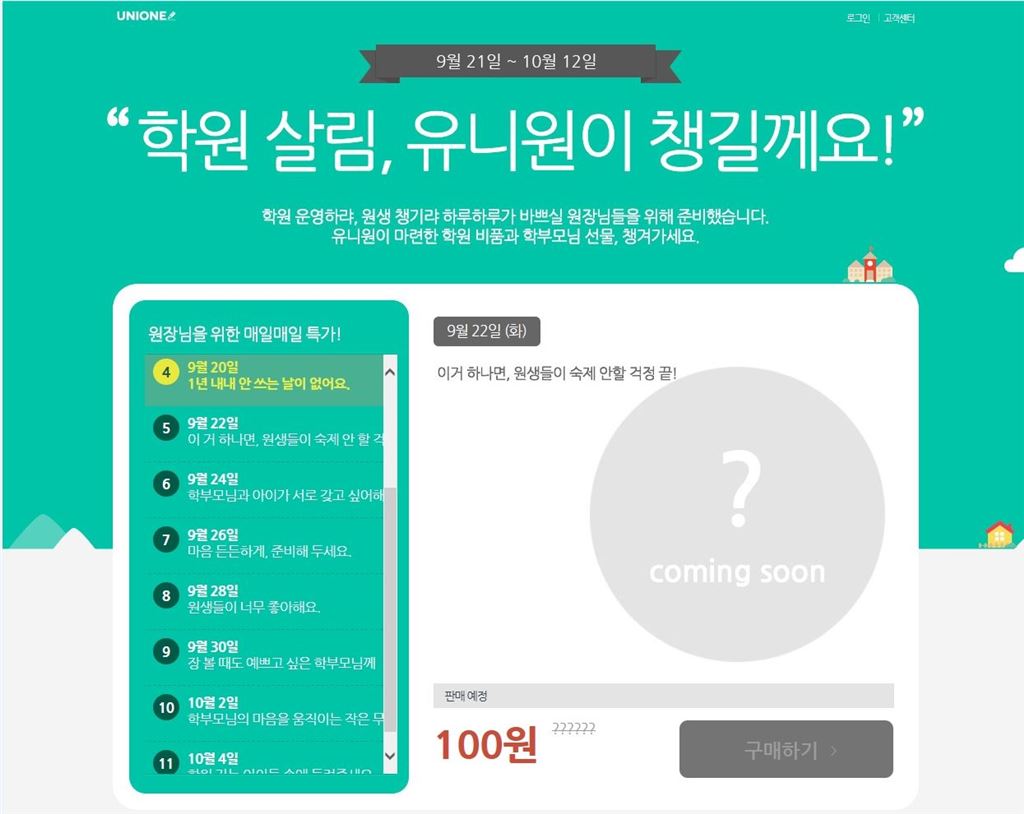 NHN엔터, 학원 비품 100원 제공 이벤트학원 운영 서비스 '유니원' 가입 대상자[아시아경제 안하늘 기자] NHN엔터테인먼트가 학원 관리 서비스 '유니원(UNIONE)'을 통해 21일 학원 운영에 필요한 비품을 100원에 제공하는 구매딜 이벤트를 펼친다고 밝혔다. '유니원'은 NHN엔터가 페이코 ID를 기반으로 새롭게 선보이는 학원 운영 관리 서비스다. 어학·예체능·보습 학원을 운영하는 학원 사업자(학원장)와 학부모 누구나 이용할 수 있다. 홈페이지(//unione.payco.com)에서 회원 가입 및 학원 등록을 하면 별도의 단말기나 프로그램 설치 비용 없이 바로 사용할 수 있다. 모바일 서비스 또한 제공해 구글플레이 또는 애플 앱스토어에서 학원 원장 및 선생님은 '유니원 학원용' 애플리케이션(앱)을, 학부모는 '유니원 학부모용' 앱을 다운로드 해 사용하면 된다. 학원장은 '유니원'을 활용해 터치 한번으로 학부모들에게 아이의 등원을 알리고, 알림장을 통해 학부모와 빠르게 소통할 수 있다. 또, 원비 납부 현황을 실시간으로 확인하고 청구할 수 있어 학원 운영과 학부모 소통을 한번에 해결할 수 있게 된다. 학부모는 아이 등원이 어려운 경우 터치만으로 결석을 알릴 수 있고, 셔틀 버스의 위치를 실시간으로 확인할 수 있다. 이밖에 학원의 주요 알림 사항과 과제를 확인할 수 있을 뿐 아니라, 페이코 결제를 통해 학원 방문 없이 비밀번호 6자리 입력만으로 원비를 간편하게 결제할 수 있다. NHN엔터는 학원 사업자를 대상으로 학원 운영에 필요한 비품을 100원에 구매할 수 있는 이벤트도 준비했다. 이번 이벤트는 다음달 12일까지 3주간 진행된다. NHN엔터는 매주 월요일, 수요일, 금요일 오후 2시에 딜을 열며, A4용지 2500매, 종이컵 8박스 등 학원 운영에 필요한 소모품과 학원 홍보물품을 정가에 관계없이 모두 100원에 한정수량 판매한다. 참여를 원하는 학원 사업자(학원장)는 유니원 가입 후 이벤트 페이지(//unione.payco.com/event/100won4u)를 통해 가능하며, 1회에 한해 선착순으로 구매할 수 있다.안하늘 기자 ahn708@asiae.co.kr<ⓒ세계를 보는 창 경제를 보는 눈, 아시아경제(www.asiae.co.kr) 무단전재 배포금지>