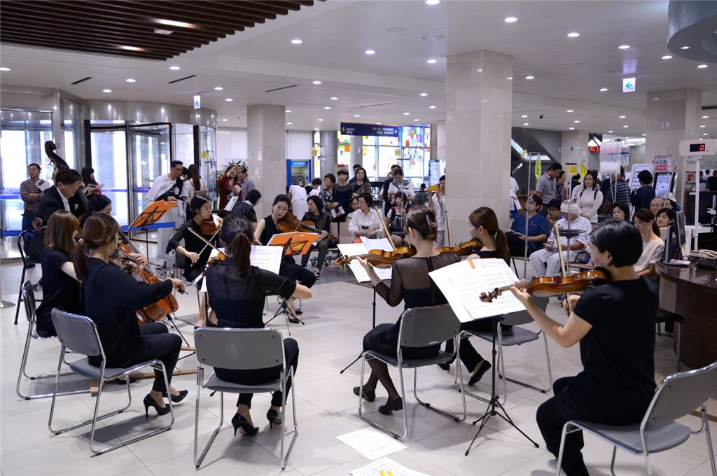 [아시아경제 이종길 기자]서울시립교향악단이 중동호흡기증후군(메르스) 사태로 침체된 지역 분위기를 되살린다. 12월까지 열리는 '시민과 함께하는 희망음악회'를 통해서다. 메르스와 사투를 벌였던 지역병원 다섯 곳과 미술관, 야외공연장, 박물관 등 지역 문화 공간 다섯 곳에서 무료 연주를 펼친다.첫 공연은 22일 강동성심병원과 건국대학교병원의 로비에서 각각 진행됐다. 병원 의료진과 환우, 지역주민 등이 모인 자리에서 현악 체임버 팀과 현악 4중주 팀이 모차르트의 '아이네 클라이네 나흐트 뮤직', 드보르자크의 '유모레스크' 등 감미로운 클래식 음악을 선사했다. 영화 '여인의 향기' OST 등 드라마나 영화를 통해 대중에게 친숙한 음악도 곁들였다.서울시향은 향후 강동경희대학교병원, 서울대학교병원, 서울의료원 등 메르스의 피해를 받은 의료기관을 찾아갈 계획이다. 서울시립미술관, 정동극장 야외마당 등에서의 소규모 실내악도 준비하고 있다.최흥식 서울시향 대표이사는 "2005년부터 시민 무료 공연을 70여회 진행했다"며 "이번 음악회로 메르스의 피해를 받은 병원들이 활기를 되찾고, 많은 시민들이 클래식에 쉽게 다가가길 바란다"고 했다.이종길 기자 leemean@asiae.co.kr<ⓒ세계를 보는 창 경제를 보는 눈, 아시아경제(www.asiae.co.kr) 무단전재 배포금지>