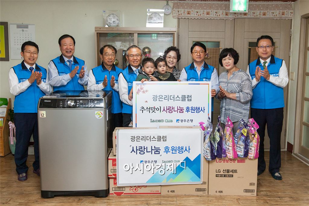 [아시아경제 노해섭 기자]JB금융그룹 광주은행(은행장 김한)은 지역 우수 중소기업 CEO 모임인 ‘광은리더스클럽’이 추석을 앞둔 23일 소외된 이웃들과 함께하는 ‘추석맞이 사랑나눔 행사’를 펼쳤다.이날 광은리더스클럽 김홍균 회장을 비롯한 광은리더스클럽 회장단과 광주은행 송종욱 부행장은 광주 동구의 아동양육시설 ‘광주영신원’과, 남구의 아동양육시설 ‘신애원’을 방문했다. 광은리더스클럽은 이들 시설에 성금 및 세탁기·이불 등을 전달하며 온정과 관심이 더욱 필요해지는 추석 명절을 앞두고 사랑 나눔을 직접 실천했다.행사에 참석한 광은리더스클럽 김홍균 중앙회장(남선산업 회장)은 “우리지역 각 분야 최고 CEO로 구성된 광은리더스클럽은 회원들의 뜻을 모아 주변의 소외계층에게 따뜻한 나눔을 실천하고, 지역 발전을 도모하는 등 사회적 책임을 이행하는데 최선의 노력을 다하겠다”고 말했다.한편, 광은리더스클럽은 광주은행과 함께하는 지역 우수 중소기업 CEO 모임으로, 2007년 9월 139개 회원사로 창립한 이후 약260여명의 회원을 보유한 지역 CEO들의 명문 클럽으로 성장했다. 특히 광은리더스클럽은 꾸준한 사회공헌 활동과 지역사회 일자리 창출에 앞장서는 등 지역사회 리더로서 사회적 책임에 솔선수범하고 있다. 노해섭 기자 nogary@<ⓒ세계를 보는 창 경제를 보는 눈, 아시아경제(www.asiae.co.kr) 무단전재 배포금지>