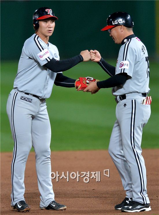 [인천=아시아경제 김현민 기자] 2015 KBO리그 LG 트윈스와 SK 와이번스의 경기가 30일 문학야구장에서 열렸다. 4회초 1사 1,2루에서 LG 오지환이 선취 1타점 2루타를 치고 한혁수 코치와 하이파이브하고 있다. 김현민 기자 kimhyun81@asiae.co.kr<ⓒ세계를 보는 창 경제를 보는 눈, 아시아경제(www.asiae.co.kr) 무단전재 배포금지>