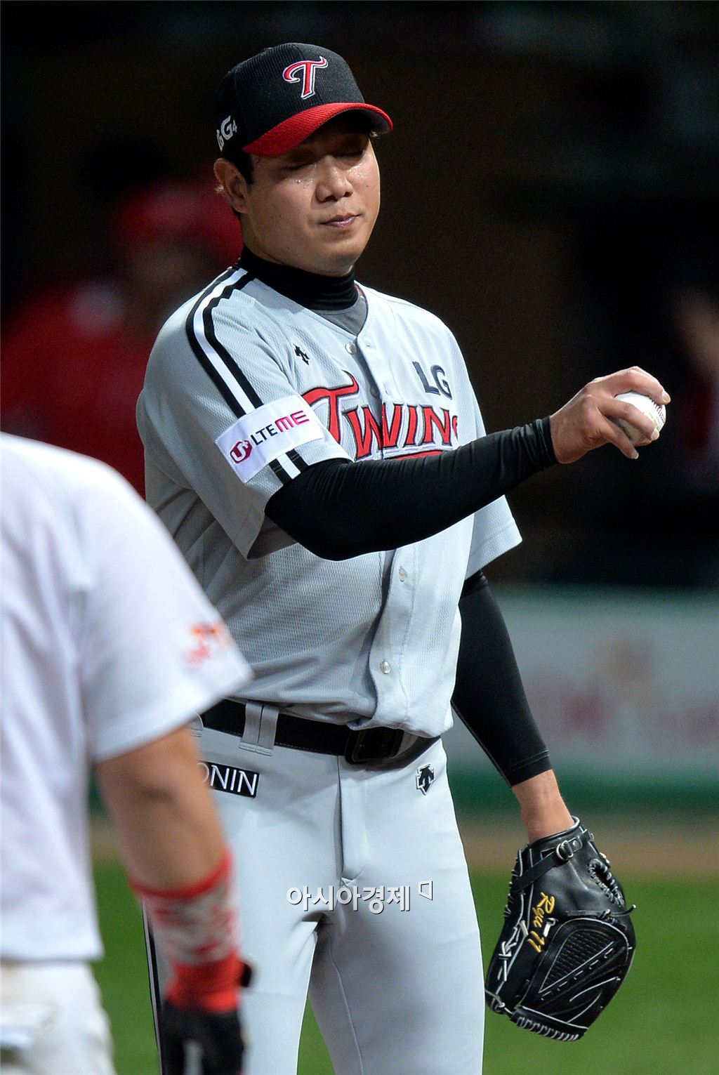 [인천=아시아경제 김현민 기자] 2015 KBO리그 LG 트윈스와 SK 와이번스의 경기가 30일 문학야구장에서 열렸다. 6회말 2사 1,3루에서 LG 류제국이 SK 정상호 타석 때 폭투를 던져 추가 실점한 뒤 아쉬워하고 있다. 김현민 기자 kimhyun81@asiae.co.kr<ⓒ세계를 보는 창 경제를 보는 눈, 아시아경제(www.asiae.co.kr) 무단전재 배포금지>