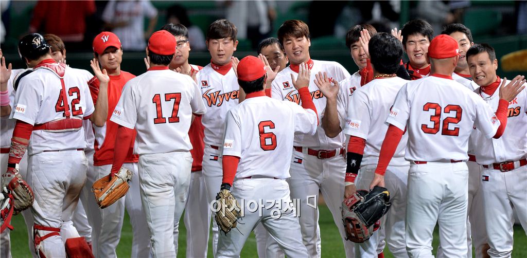 승리를 자축하는 SK 선수들[사진=김현민 기자]