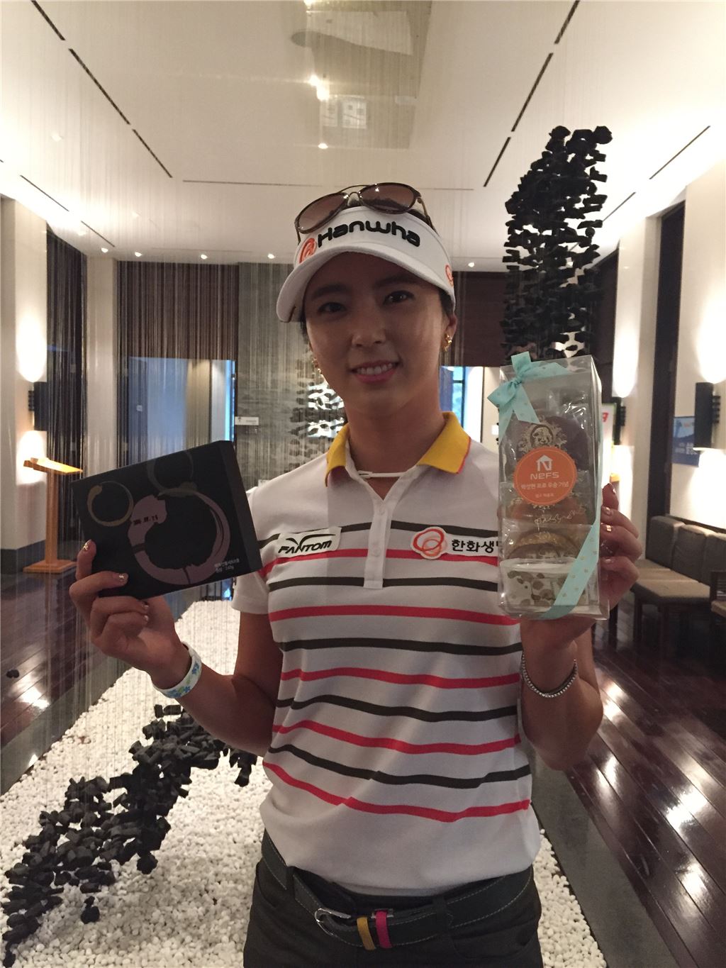 윤채영이 대우증권클래식 우승자 박성현이 돌린 '우승턱' 떡과 쿠키를 들고 있다.